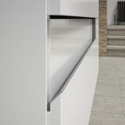 Tiroirs: Poignées chromées, Charnières amorties - Sortie amortie - Sortie totale -tiroir mélaminé finition textile