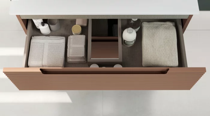 Tiroirs: Charnières amorties - Sortie amortie - Sortie totale -tiroir mélaminé finition textile