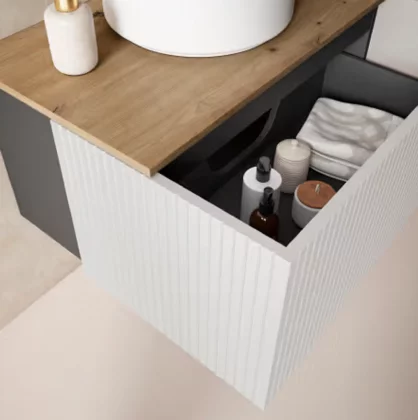Tiroirs: Charnières amorties - Sortie amortie - Sortie totale -tiroir mélaminé finition textile